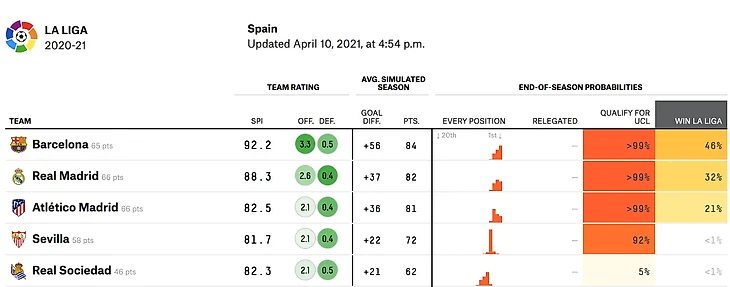 Вот прогнозируемая турнирная таблица. У «Барсы» 46 процентов шансов на победу, «Реал Мадрид» следует за ними с 32 процентами, «Атлетико Мадрид» замыкает тройку лидеров с 21%.