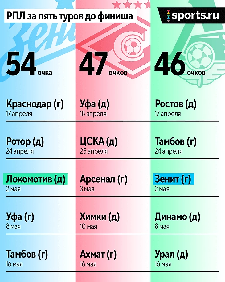 • «Зениту» еще предстоит игра с кризисным «Краснодаром» и матчи с тремя последними командами лиги («Ротор», «Уфа», «Тамбов»), две из которых борются за попадание в стыки на выбывание. У «Спартака» матчей с выживающими командами тоже два ( «Уфа» и «Арсенал»), а завершат чемпионат москвичи в играх с «Химками» и «Ахматом».