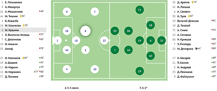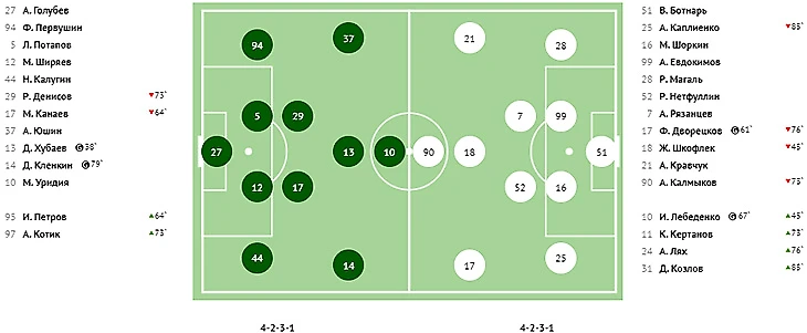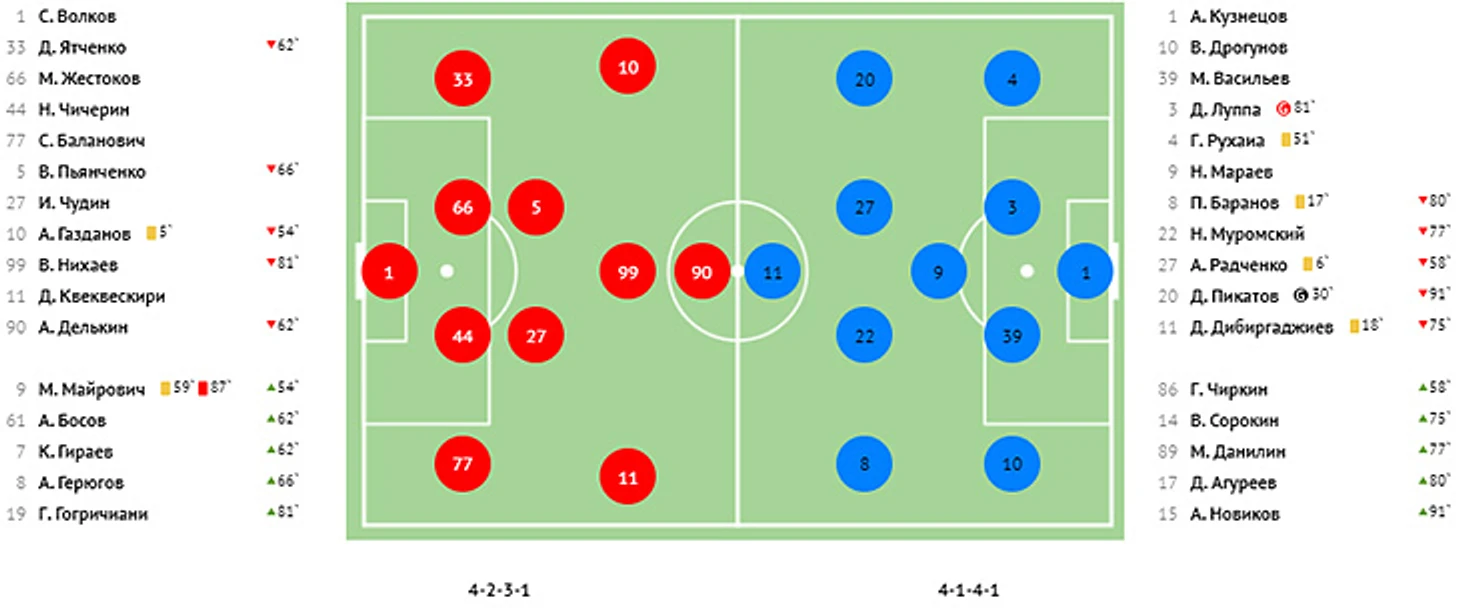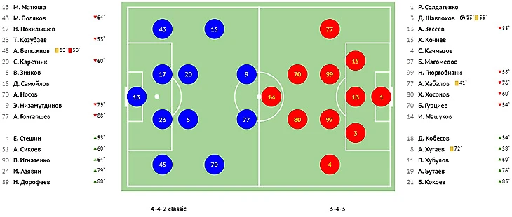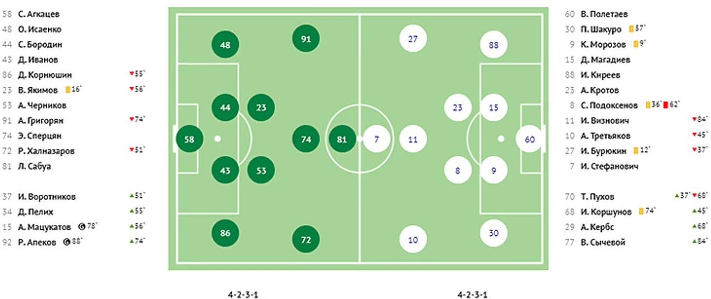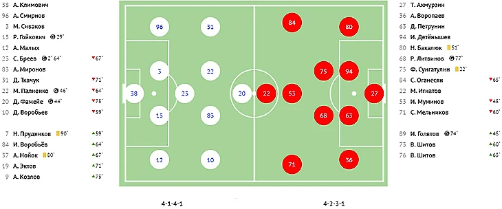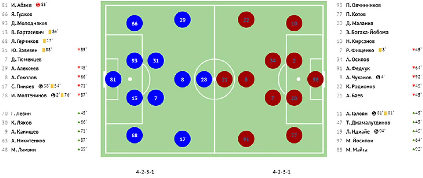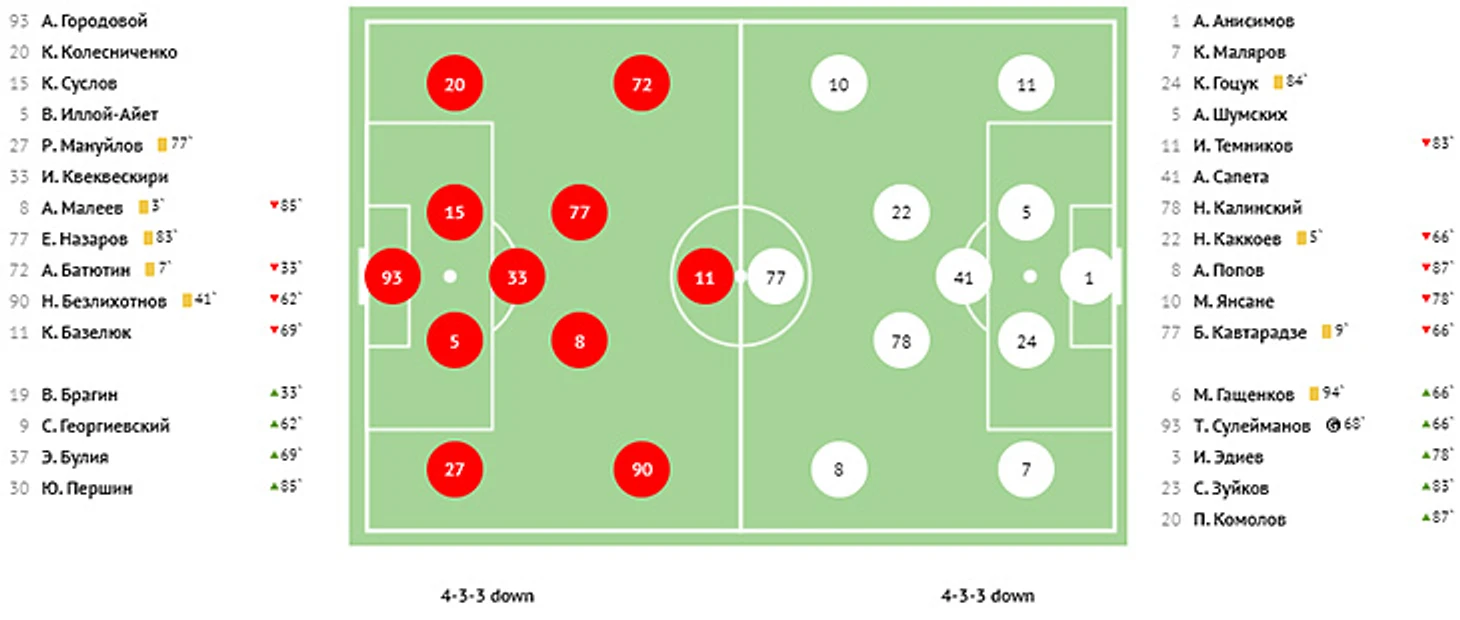Голы: Молтенинов, 3 (1:0). Чуканов, 4 (1:1). Пиняев, 39 (2:1). Галоян, 82 - c пенальти (2:2). Абаев, 86 - в свои ворота (2:3). Ндиай, 90+ (2:4).