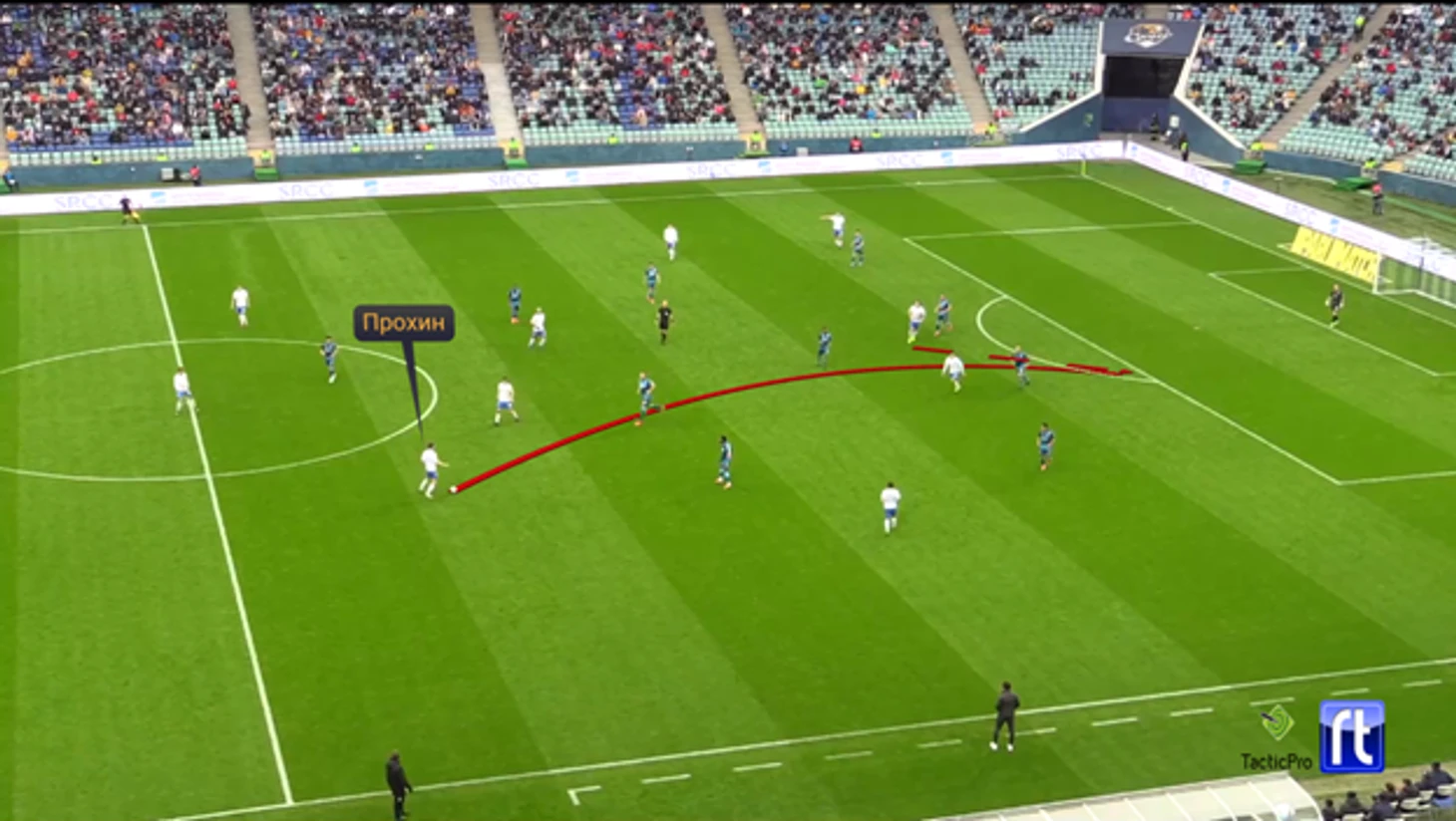 Если у «Зенита» получалось выйти из-под прессинга, то «Сочи» располагался компактно и достаточно узко, не давая сопернику развивать атаки через центр поля. Заика и Терехов располагались достаточно узко относительно своих центральных защитников. Да, «Зенит» забрал полностью фланги под свой контроль (27 навесов за матч), но за счет высокой плотности в штрафной и игре на подборах, большинство навесов контролировались игроками «Сочи». Благодаря более узкому расположению при оборонительных действиях, «барсы» не позволили «Зениту» выстраивать атаки через центр и полуфланги. В итоге «сине-бело-голубые» были вынуждены разворачивать свои атаки с фланга на флаг через защитников. При развороте «Сочи» старались прессинговать Чистякова и Ракицкого.