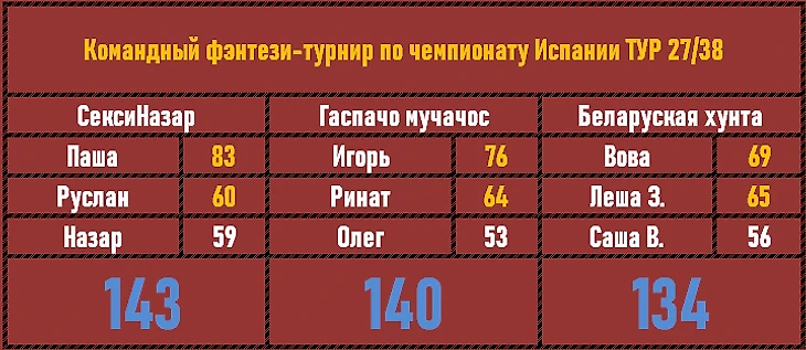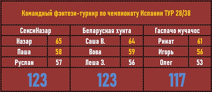 4 тура попали в обзор в этот раз в чемпионате Испании. Публикуем результаты Дятложуев в каждом туре, а вперемежку - общий зачет.