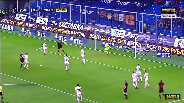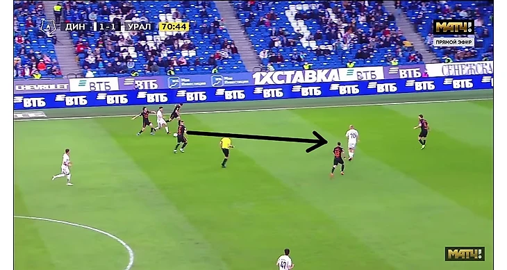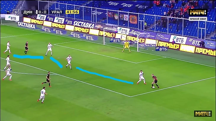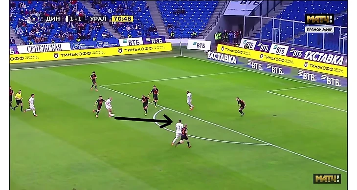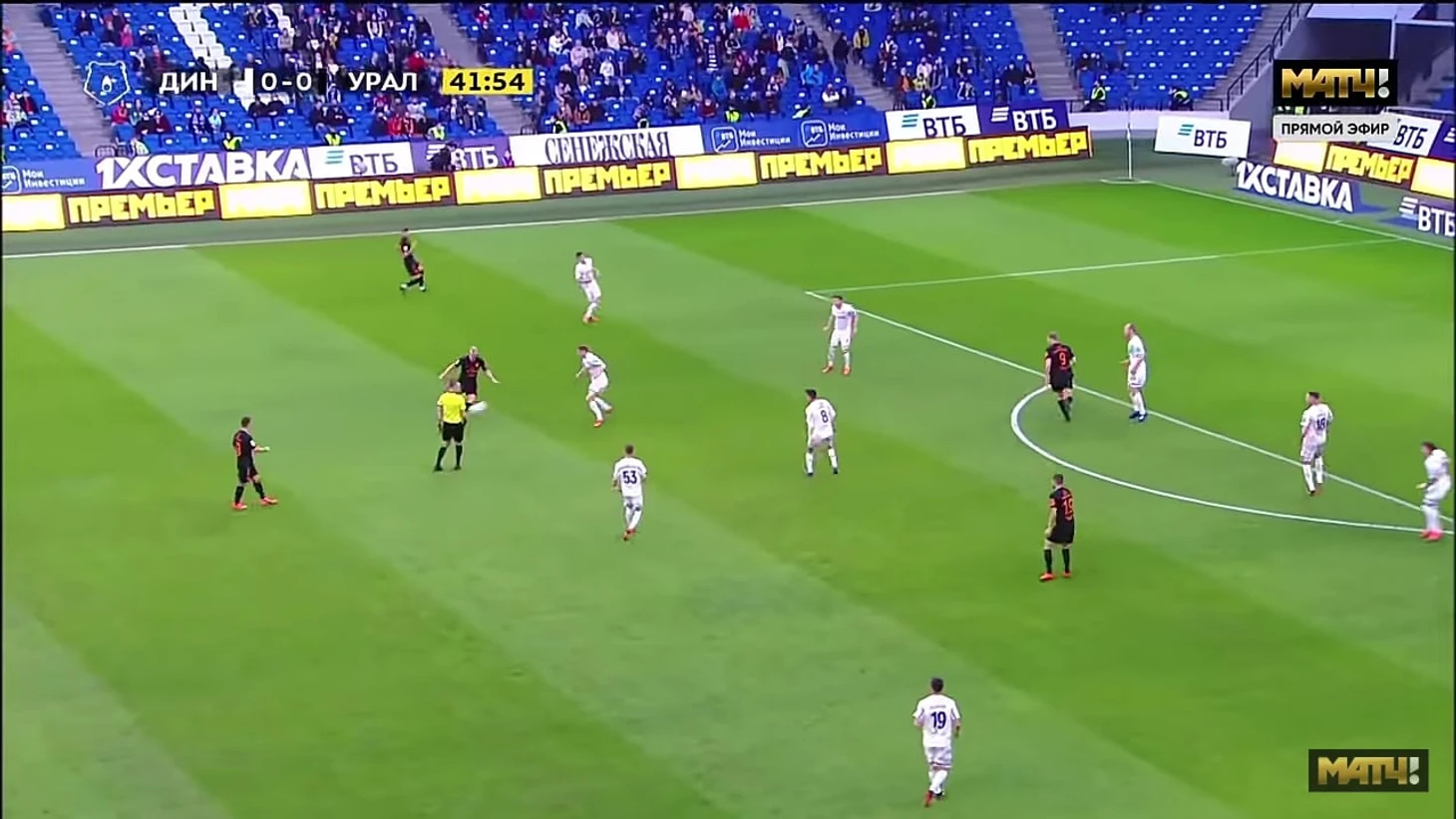 Несколькими днями ранее команда Сандро Шварца неожиданно для всех вылетела в 1/4 финала кубка России от самарских «Крыльев Советов» (0:2). «Динамо» необходимо было во что бы то ни стало реабилитироваться в глазах своих болельщиков на своем стадионе. Тренерский штаб «Урала» во главе с Юрием Матвеевым грамотно выстроил защитную линию, не давая возможность соперникам выйти в численное преимущество. Переход из обороны в атаку был сосредоточен на выносах в сторону Погребняка, и за счет своего роста Павел должен был цепляться за мяч и начинать атаки екатеринбуржцев. Центральному защитнику Роману Евгеньеву гораздо чаще удавалось выигрывать верховые единоборства в центре поля. Понимая это, «Урал» начинал переходить на фланги для создания немногочисленных атак. «Динамо» не мог создать у ворот соперника практически ничего, не было необходимых скоростей и не хватало остроты. Позиционная атака не приносила пользу. Как отметил главный тренер Сандро Шварц: «В первом тайме не получалось находить свободные зоны. Мы очень медленно играли в первом тайме, медленно двигали мяч». В моменте с голом можно увидеть, что в зародыше атаки хозяева имели численное преимущество за линией мяча. 7 игроков «Динамо» участвовали в обороне и 4 футболиста «Урала» (Егорычев на правом фланге, не видно на фото) делали открывания для получения мяча от Подберезкина. При этом 2 из них находились без какой-либо опеки (Мишкич и Егорычев).