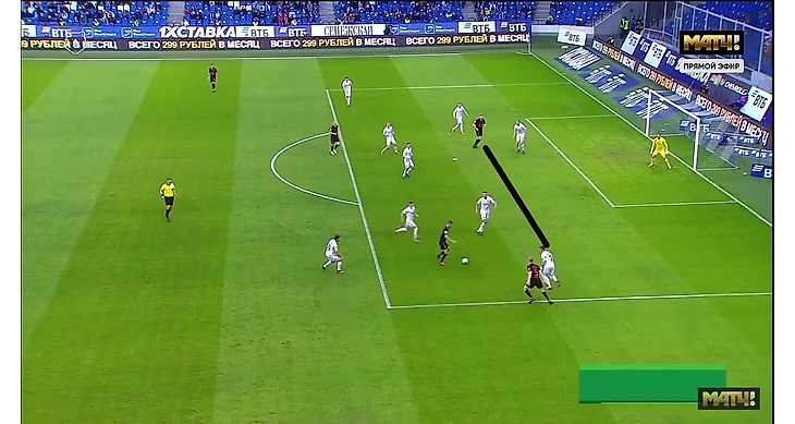 Далее следует перевод направо, где крайний полузащитник спокойно принимает мяч. Паршивлюк смещается к нему и увеличивает ширину защитной линии. Мишкич до сих пор находится совершенно один, закономерно принимает передачу от Егорычева и продолжает продвигать мяч в штрафную площадь без особых проблем.