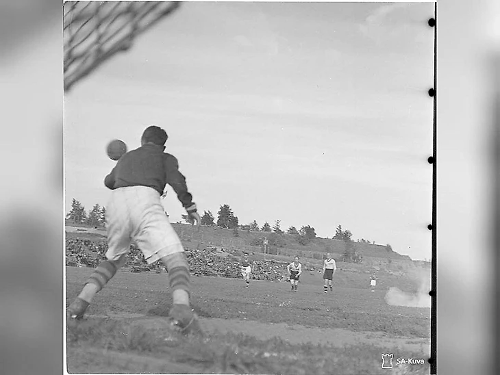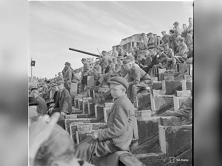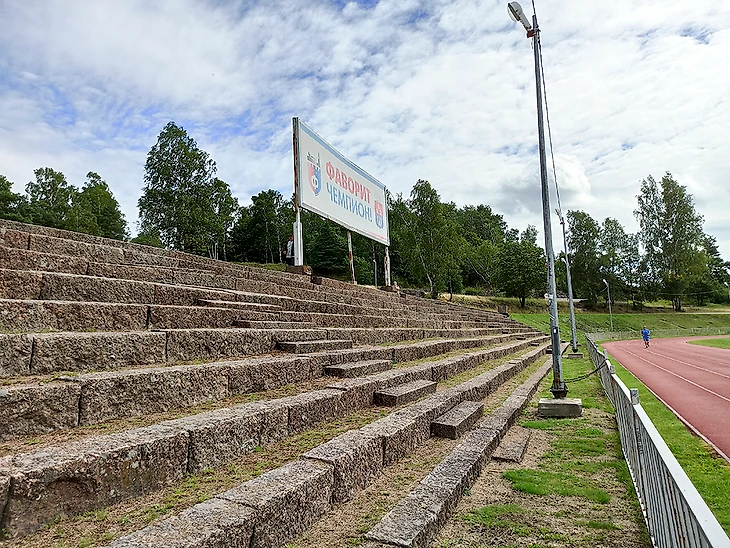 Стадион Авангард в Выборге был построен ещё финами в 30-е годы и имеет особый национальный колорит – у подножья скалы он буквально переходит в парк. Была построена одна трибуна в модном в то время в Финляндии стиле функционализма, окружающая среда была приспособлена под остальные трибуны – их высекли из ближайших гранитных скал. Вообще гармоничные отношения человека и природы – одна из особенностей финской культуры, что меня особенно очаровывает. После строительства комплекс назывался «Центральный стадион» (Keskusurheilukenttä). Стал он одним из крупнейших в Финляндии. Здесь планировалось проводить футбольные матчи несостоявшейся Олимпиады 1940 года. Во время войны на стадионе проводились и свои военные матчи (на фото матч ФК «Судет» (Выборг) – ФК «ХПС» (Хельсинки) 05.07.1942).