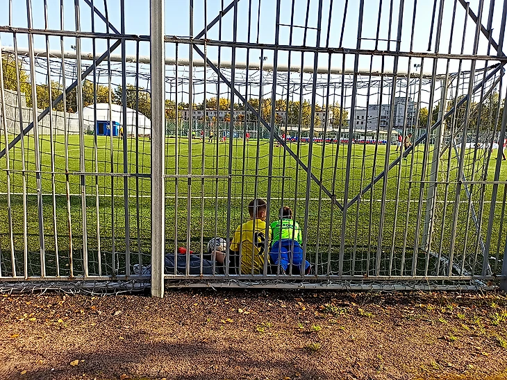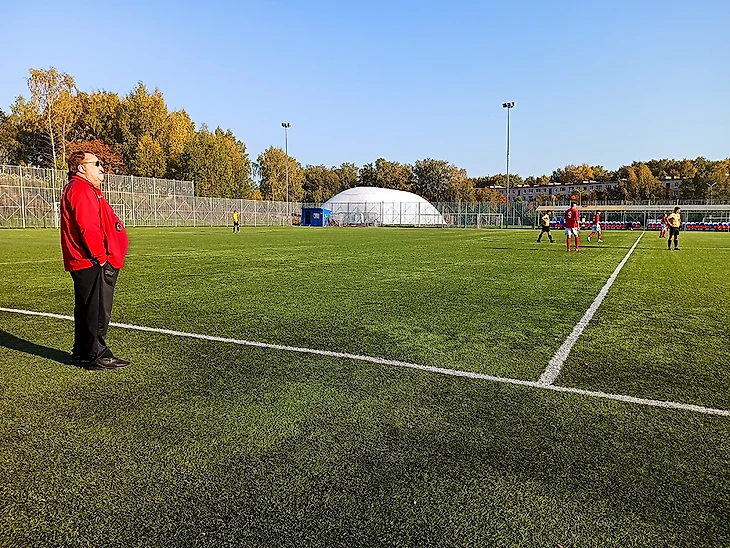 Через полчаса меня ждало разочарование дня: футболисты Факела прошли для разминки на запасное поле, синтетическое, огражденное высоким забором и украшенное пластиковыми креслами с трогательным российским триколором. Посещение матча на этом пластмассовом чуде явно не входило в мои планы. И тут я обратил внимание, что на основном поле даже не натянуты сетки на воротах. Расстроенный, с поникшей головой, я потопал к запасному полю. Здесь пообщался с главным тренером Фаворита - это Александр Власович Русаков, он тренирует команду уже с 2001 года и прошел с ней огонь, воду и медные трубы.