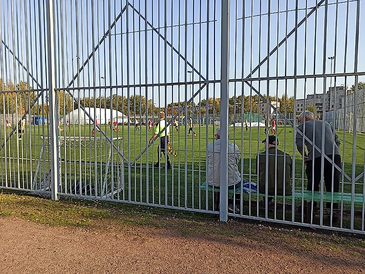 От Александра Власовича я узнал, что по новым антитеррористическим правилам стадион должен быть окружен забором высотой не ниже 2,5 метров, а как я уже говорил, в Выборге стадион и городской парк – это, по сути, одно целое, проход ни как не ограничен. Сейчас вроде как планируют поставить забор, но до этого все игры будут проходить на запасном поле. Все-таки охрана «по блату» пустила довольно много болельщиков внутрь площадки – тех кого знали лично, мне же пришлось ошиваться за оградой.