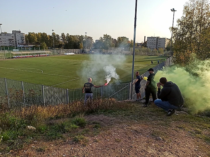 Минуте на 15-й подтянулись четверо немолодых фанатов Фаворита с пивом и шутками. Парни похоже явно не ожидали гостей-фанатов из Киришей. Поддержка команды от них была довольно дружная, с периодическими подбадриваниями отдельных игроков, типа: «Молодец! В следующий раз обязательно получится», или вратарю: «Давай, Игорёк, напихай им как следует». В конце матча зажгли файер и дым. В общем молодцы!