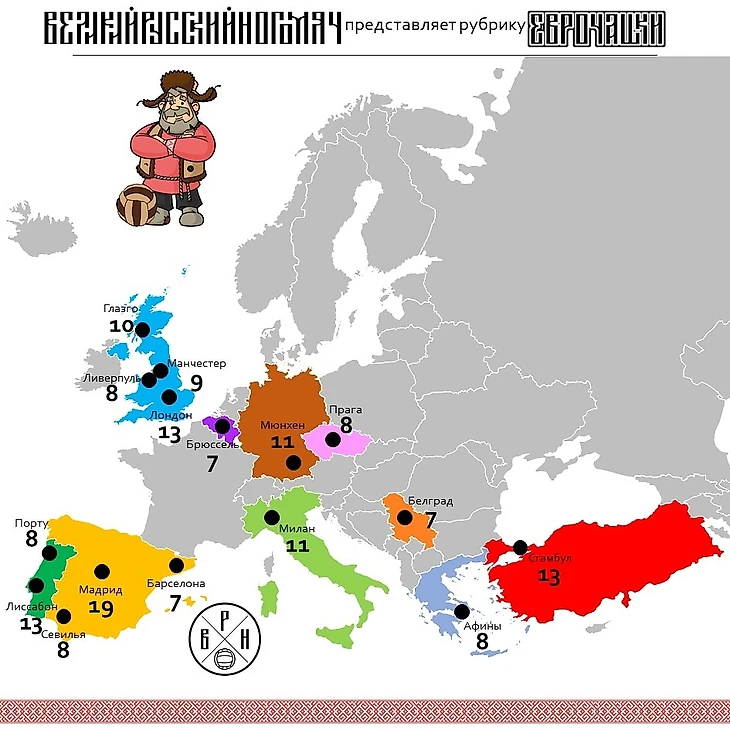 Сегодня в рубрике #Еврочашки представлена карта стран с городами, где чаще всего наши клубы играл в еврокубках. Тут, конечно, не все, а только ТОП15, где прошло 7 и более матчей, даже с учетом финалов кубков УЕФА