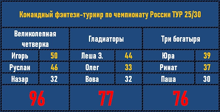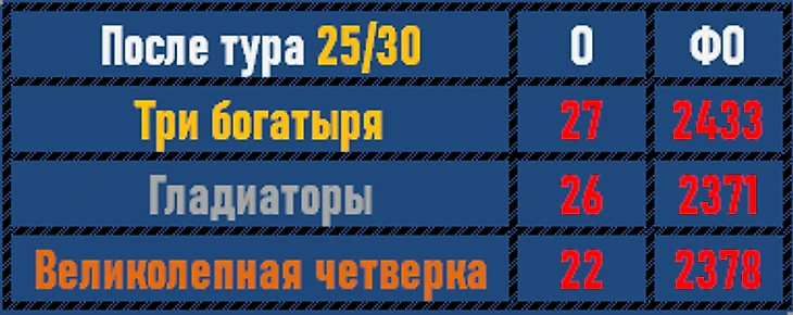 Таким образом, отрыв сократился до 1 очка. За пять туров и Великолепная четверка может догнать и обогнать соперников.