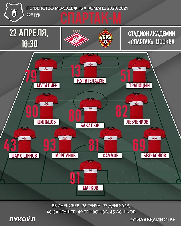 «Спартак»: Марков, Шайхтдинов, Саумов, Моргунов, Трапицын, Безчаснюк, Бакалюк (Денисов, 46), Левченков (Трифонов, 87), Шильцов, Кутателадзе (Лошков, 80), Муталиев (Генчу, 90).