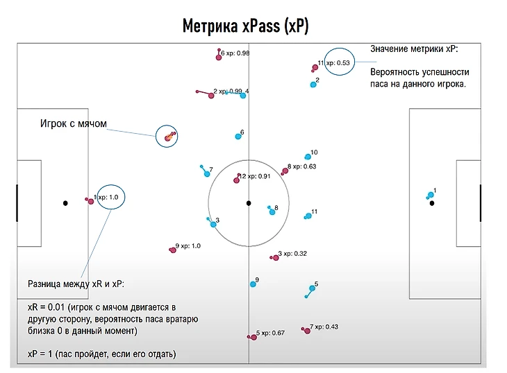 Данная метрика для каждого игрока команды, владеющей мячом, оценивает вероятность успешности паса. Другими словами - она оценивает насколько сложно сделать все возможные передачи в текущем игровом эпизоде и какие из них являются менее рискованными, а какие более.
