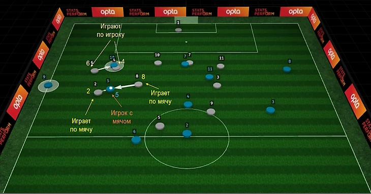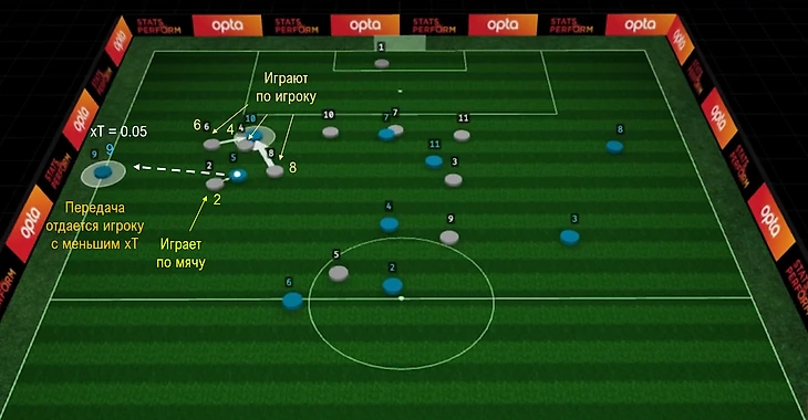 Серые игроки 2 и 8 в данном эпизоде играют по игроку с мячом, их роль - Ball-orientated defending. Они стремятся сделать так, чтобы 5 сделал передачу игроку с меньшим xT.