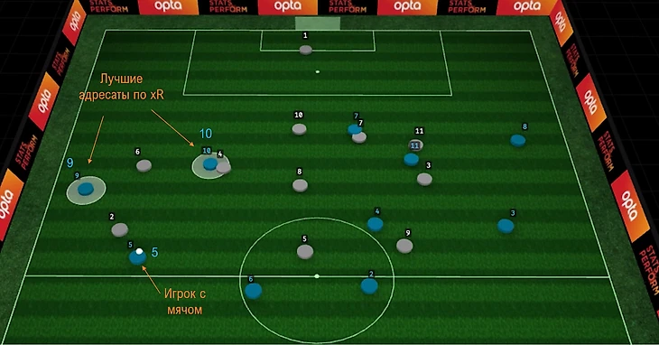 1. Синяя команда атакует. Игрок 5 получил мяч. Модель определяет для него двух наиболее вероятных адресатов (наибольшие значения xR) - игроки 9 и 10.