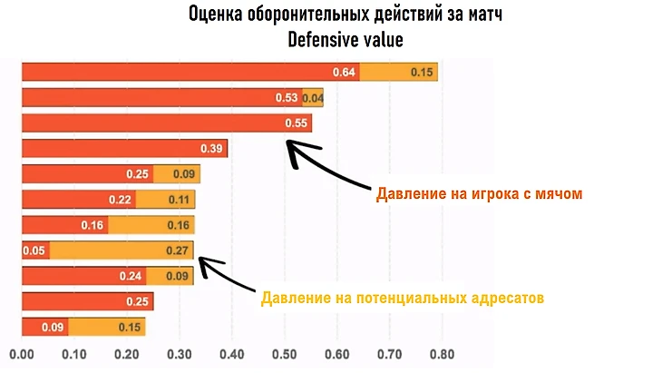 Игрок, находящийся на первом месте по defensive value, предотвратил 0.64 удара по своим воротам оказывая давление на игроков соперника на мяче и 0.15 ударов, играя по игрокам без мяча.