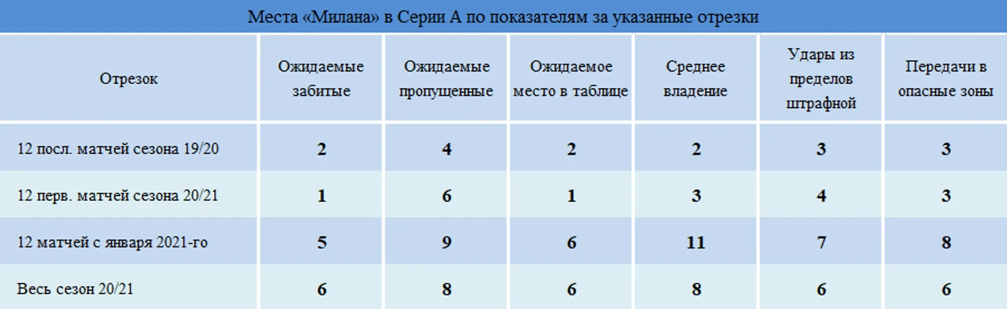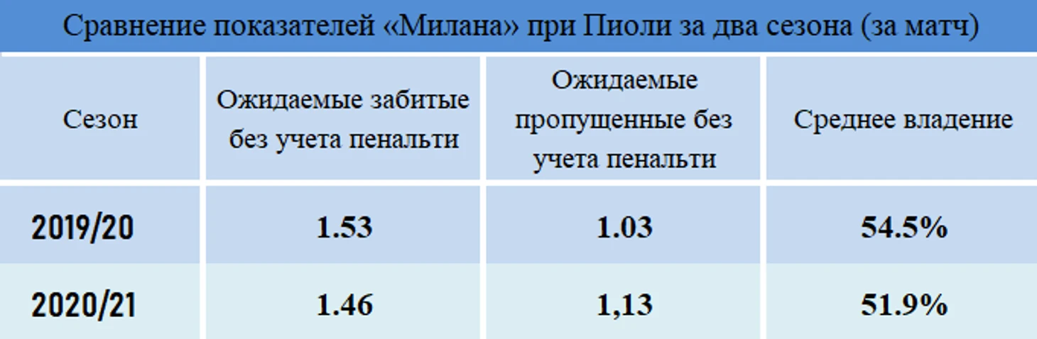 А, к примеру, в отрезке после локдауна и до конца прошлого сезона «Милан» реально был одной из лучших команд Серии А по многим показателям: 2,23 xG и 1,12 xGA за матч – второй и четвертый лучшие показатели, +12.6 разница ожидаемых забитых и пропущенных без учета пенальти – второй лучший показатель, 2,09 ожидаемых очка за игру – снова второй лучший показатель.