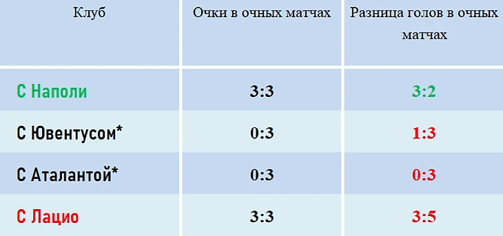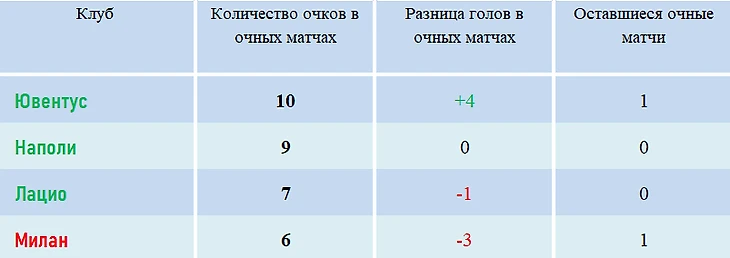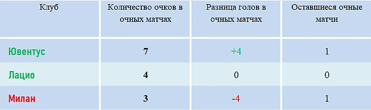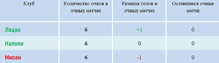 На данный момент, при равенстве очков «Милан» опережает в таблице только «Наполи» – обе команды набрали по 3 очка в очных противостояниях, но у миланцев лучше разница голов (3:2). «Лацио» будет выше «Милана» по тем же показателям – 3:3 по очкам, но 3:5 по голам в пользу команды Симоне Индзаги.