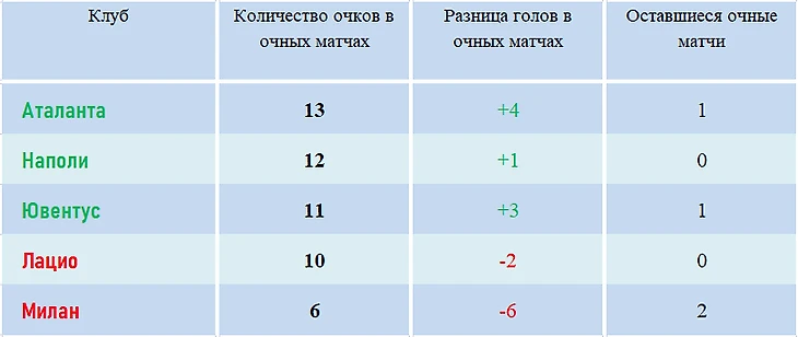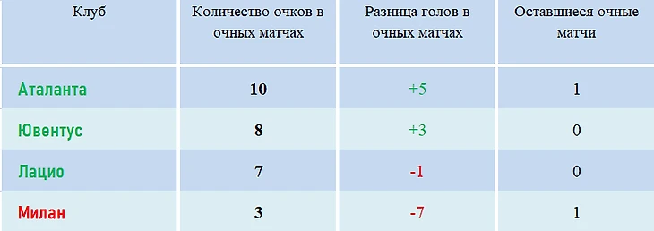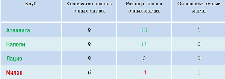 Итак, при равенстве очков сразу у пяти представленных ниже команд, «Милану», чтобы попасть в топ-4, будет необходимо обыграть сразу и «Аталанту», и «Ювентус» с общей разницей минимум в семь мячей в обоих поединках, но при этом туринцы должны будут быть повержены не менее, чем в три мяча.
