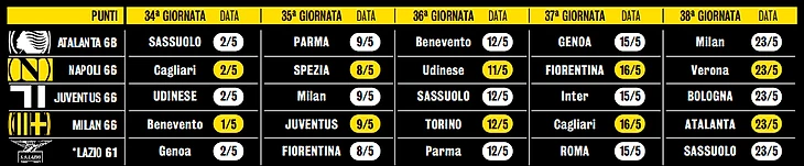 Чтобы опередить туринцев при равенстве очков с «Аталантой», «Наполи» и «Ювентусом», «Милану» будет необходимо победить их в очном матче с разницей минимум в три мяча, при этом в матче с бергамасками будет нужна хотя бы ничья.