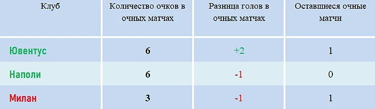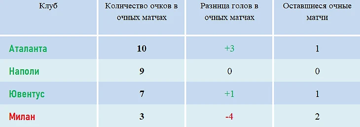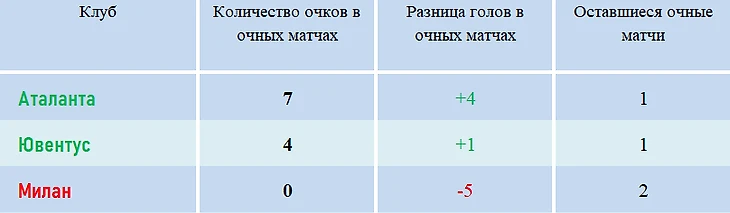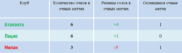С «Аталантой» и «Ювентусом» на сегодняшний день миланцы отыграли только по одной очной встрече, и чтобы опередить их по дополнительным показателям при равенстве очков «Милану» нужно победить первых с разницей минимум в 4 мяча, вторых – не менее, чем в 3 гола. В ином случае «Милан» уступит по общей разнице мячей.