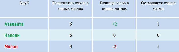 А вот так на данный момент выглядит равенство одновременно с «Аталантой» и «Наполи». «Милану» в этом случае нужно будет победить команду Гасперини минимум в три мяча. При победе в два гола у всех трех команд будет и равенство по очкам, и равенство по голам в очных поединках. Но «Милан», наиболее вероятно, уступит по общей разнице голов – следующему дополнительному показателю.
