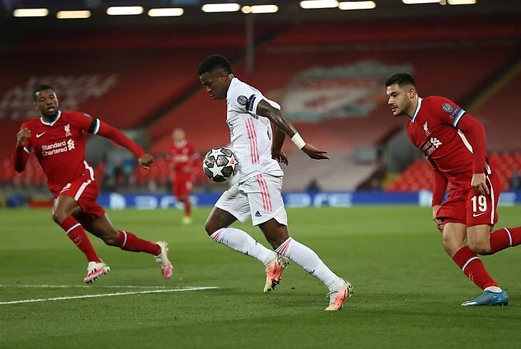 Общая черта – заготовки Зидана носят максимально конкретный характер и генерируют очень похожие выгодные для «Мадрида» эпизоды. Пожалуй, самый впечатляющий прием был против «Ливерпуля». «Мадрид» ловил паузы в давлении команды Клоппа, чтобы именно в этот момент забросить за спину высокой линии защиты – как правило, Кроос отдавал, а Винисиус открывался в проблемную зону между Трентом и Филлипсом: