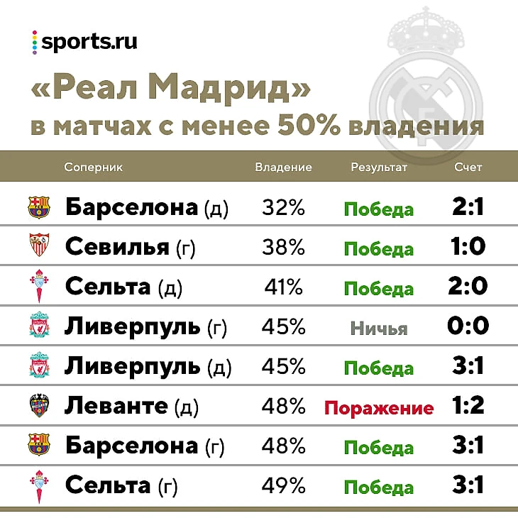 В других матчах «Мадрид» получает возможность играть на пространстве, что естественным образом подходит команде Зидана. На самом деле у «Реала» отличные результаты в любых матчах, где есть шанс отдать сопернику мяч. Просто среди топ-соперников чаще встречаются те, кто предоставляют удобные условия: