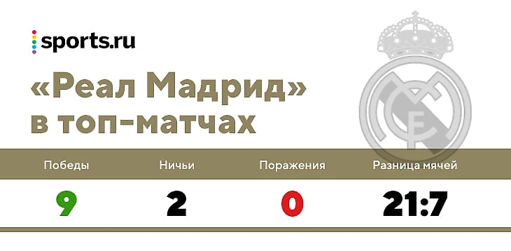 В этом сезоне «Мадрид» ни разу не проиграл в топ-матче. Точная статистика зависит от круга команд, которые мы включаем в число больших соперников, но при любых подсчетах сохраняется 0 в графе поражения. Вот один из вариантов (учтены встречи против «Барселоны», «Интера», «Севильи», «Атлетико», «Аталанты» и «Ливерпуля»):