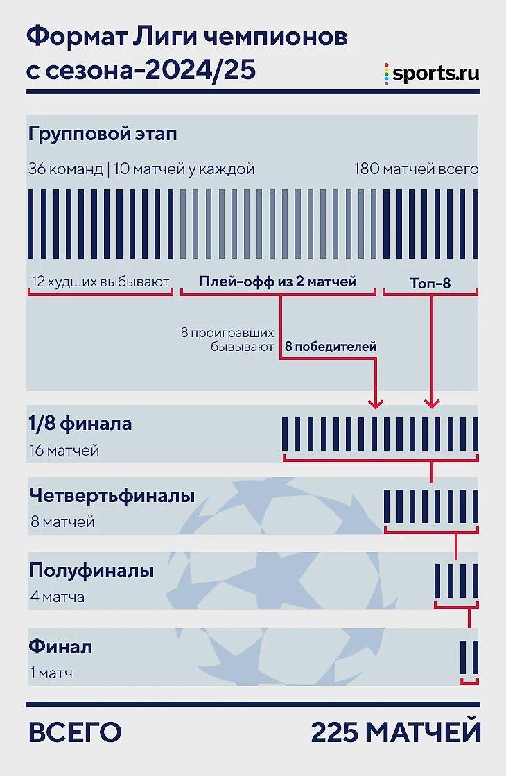 Главная – изменение глобального распределения доходов в футболе в пользу богатых клубов в Лиге чемпионов. Новый формат делает Лигу чемпионов супертурниром: 36 команд из 16 стран, 225 матчей вместо 125, топовые игры каждую неделю.