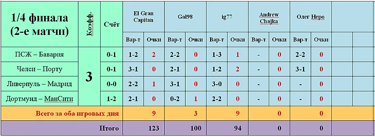 Итак, коллеги, сегодня/завтра у нас - полуфиналы. Кто-то скажет, что не все сильнейшие до них дожили, но это футбол. Как говориться, не забиваешь ты - не забивают и они забивают тебе :) Рецепт победы в каждом матче ЛЧ очень прост - надо забить больше, чем они ;)