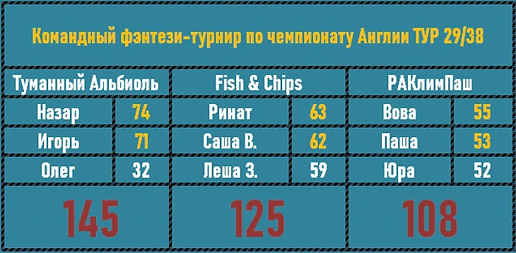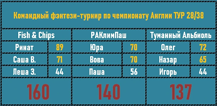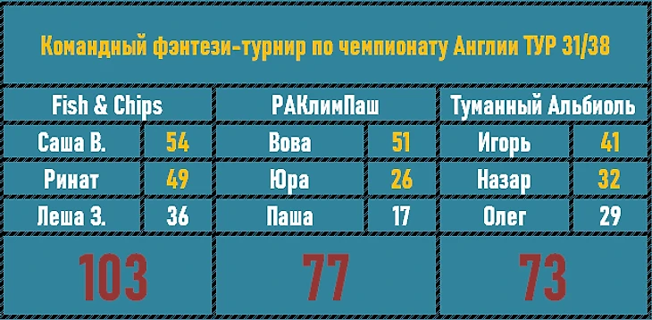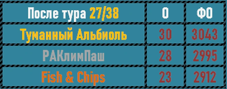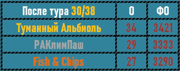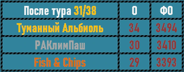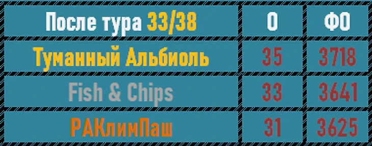 Казалось бы, 7 очков преимущества Туманного Альбиоля над Рыбкой и картохой. Но туры 31-33 почти все поменяли. Во-первых, аутсайдеры окрасились в серебряный цвет. А во-вторых, преимущество сократилось всего до 2 баллов!