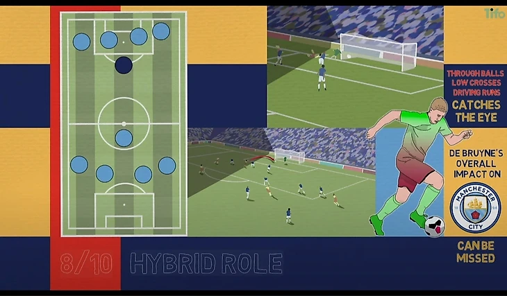 Кевин Де Брюйне в своей карьере в "Манчестер Сити" играл роль центрального полузащитника, но с важной атакующей функцией. В наиболее часто используемой "Сити" схеме 4–3–3 он занимает правую позицию из трех полузащитников, но ходит вперед, в центральную зону атаки или правую половину пространства соперника. Раньше это упоминалось как гибридная роль восьмерки или десятки. Центральный полузащитник, который проводит много времени между линиями, инициируя атаки. В предыдущих сезонах Де Брюйне часто можно было найти в центре, впереди у него было четыре "нападающих" "Сити".