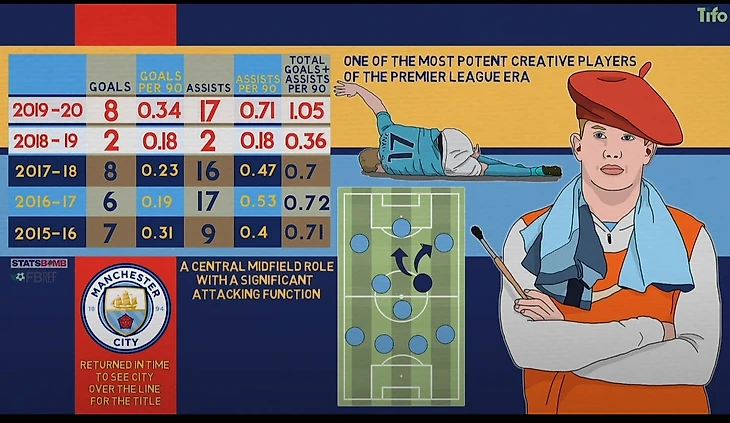 Кевин Де Брюйне по праву считается одним из самых сильных творческих игроков Премьер-лиги. В последнее время он возглавляет таблицы по результативным передачам и созданным шансам. За свою пятисезонную карьеру в "Манчестер Сити" был только один сезон, в который он не смог набрать показатель в 0,7 голов, плюс недостаточные числа голевых передач в перерасчете на 90 минут - это был сезон 2018/19, когда он провел большую часть времени за пределами поля из-за травмы.