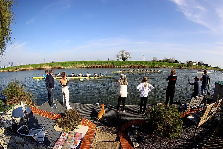 4 апреля. Мимо нас проплывает классическая лодочная регата «Оксфорд – Кембридж». Гонка прошла без болельщиков, но этим людям и рыжему псу повезло жить на берегу реки.