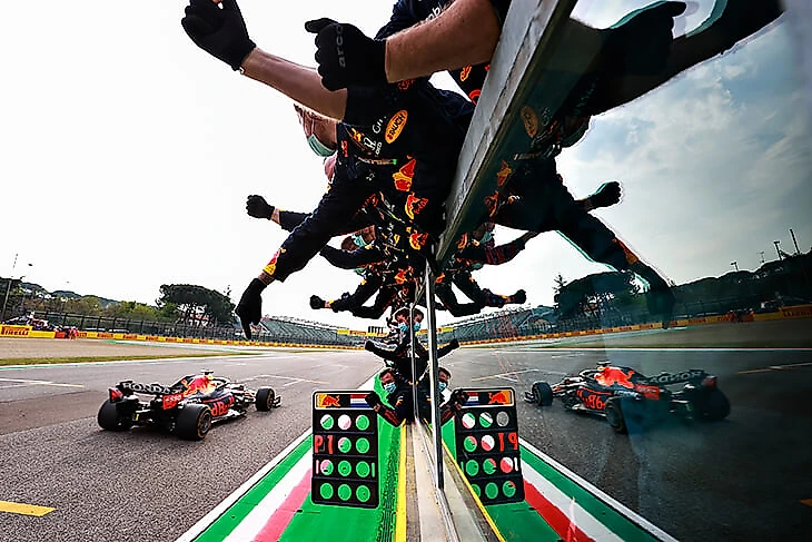 18 апреля. Победа Макса Ферстаппена и его команды отражаются на трибунах автодрома в Имоле.