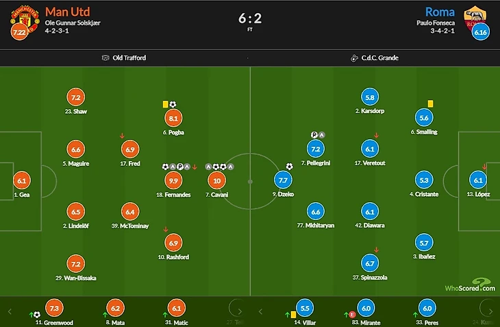 Эдинсон Кавани, чей дубль переломил ход игры, получил идеальную оценку — 10 баллов. Бруну Фернандеш, который также забил два, получил всего на одну десятую балла меньше. А вот у Поля Погба, который также отметился голом, получил гораздо меньше — всего 8,1. Как и Мэйсон Гринвуд — 7,3.