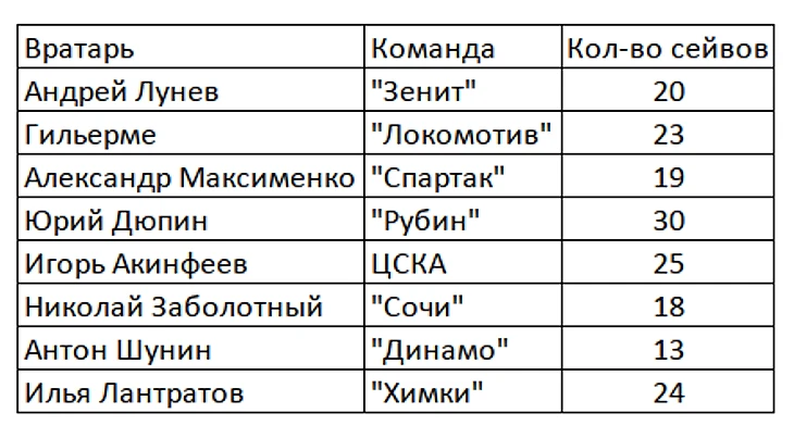 Кузьмич замечает: "... в этом году Максименко - худший вратарь Лиги!" Смелое заявление. На сайте Whoscored.com собираем данные по сейвам в каждой отдельно взятой игре этого года в Российской Премьер-Лиге. Получаем следующую таблицу (сравнение ведется по вратарям команд верхней части таблицы)