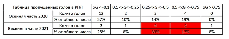 Дальше разделим голы, пропущенные "Спартаком", по значениям xG этих самых голов. Получим следующую таблицу: