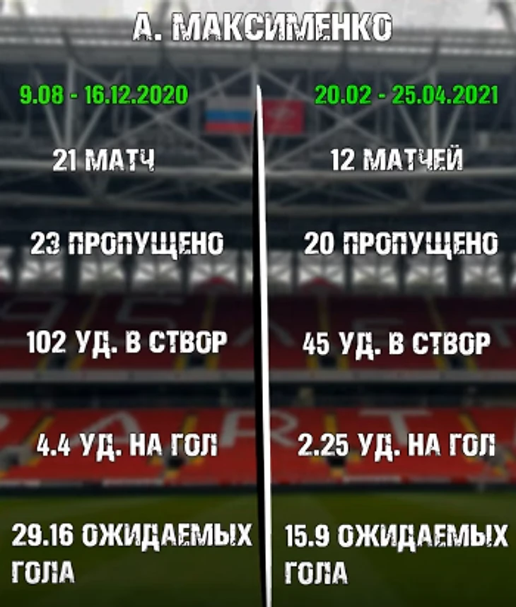 Автор обращает внимание на "зубодробительную" разницу: осенью на гол в ворота Максименко требовалось 4,4 удара, то весной - 2,25 удара. Но говорит ли это только о слабой игре стража ворот "красно-белых"? Давайте разбираться: