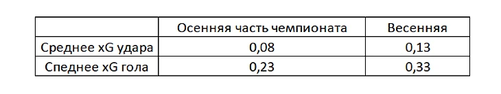 Получаем следующую таблицу, из которой следует интересный вывод: защита "Спартака" в весенней части сезона допускает у своих ворот более опасные моменты, чем осенью (xG удара по воротам вырос в полтора раза).