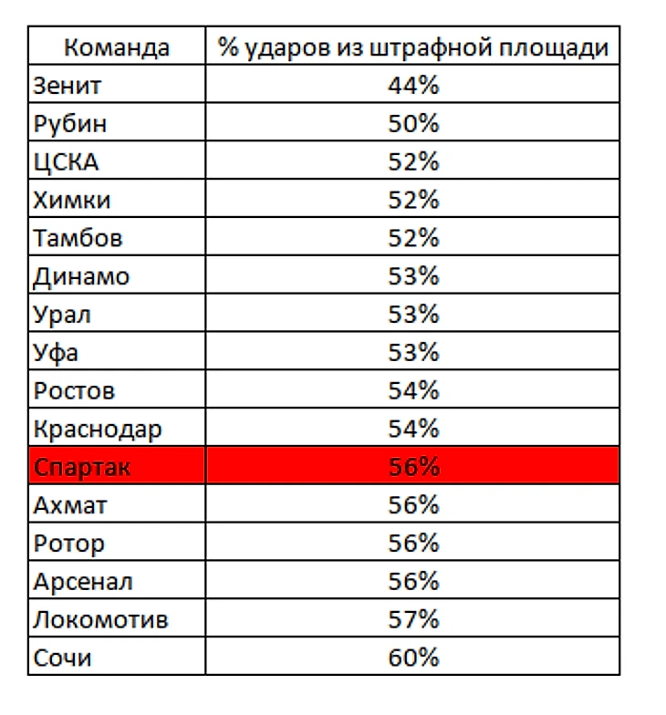Команда Доменико Тедеско в принципе не очень сильна по части обороны. Даже в выигранных матчах против "Краснодара" с шестью забитыми голами, или против "Урала", где "красно-белые" забили 5 мячей, "Спартак" не сохранял свои ворота на замке и все равно пропускал. Яркое доказательство вышеуказанного суждения: ниже приведена таблица с указанием процента нанесенных ударов по воротам соответствующей команды из пределов штрафной площади.