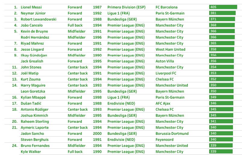 В таких новостях, традиционно, нельзя, чтобы не вспомнить Криштиану Роналду. В этом списке он лишь на 39 месте, хотя стоить признать, что плотность в таблице высокая, и 20-е место от 40-го отличается всего-то на 8 пунктов.