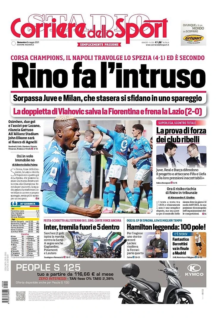 Борьба за Лигу Чемпионов, «Наполи» разгромил «Специю» (4:1) и стал вторым. Обогнали «Юве» и «Милан», которые этим вечером сразятся в личной схватке. Дубль Влаховича спас «Фиорентину» и остановил «Лацио» (2:0). Осимхен, два гола и ассист для Лосано перезагружают Гаттузо. На «Альянц Стэдиум» Джон Элканн будет рядом с Аньелли.
