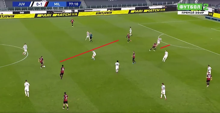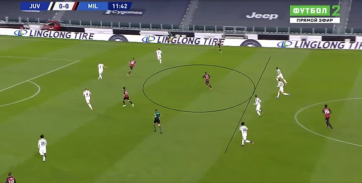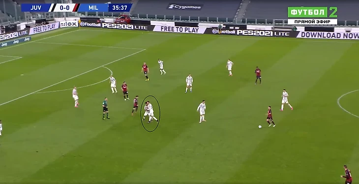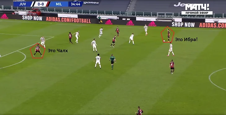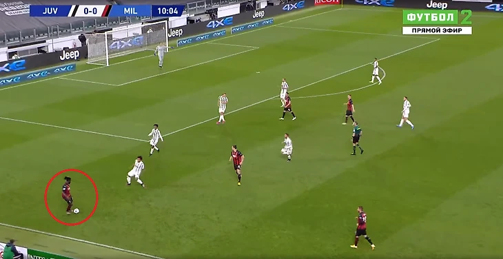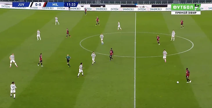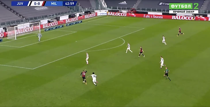 С компактностью в центре и эффективностью контрпрессинга у туринцев большая беда. Медлительность - смертельна. Особенно когда у противника такие юркие бойцы как Браим Диас. На этом стоп-кадре видно, как Браим пользуется пробелом в защитной трети хозяев, пока четыре сонных мухи плетутся сзади.