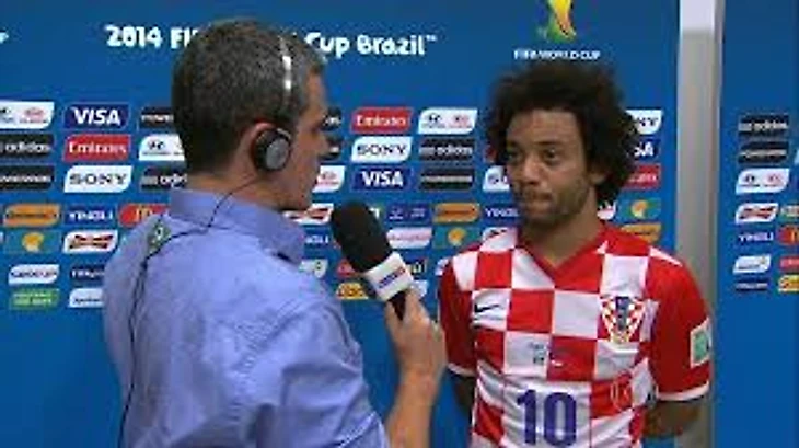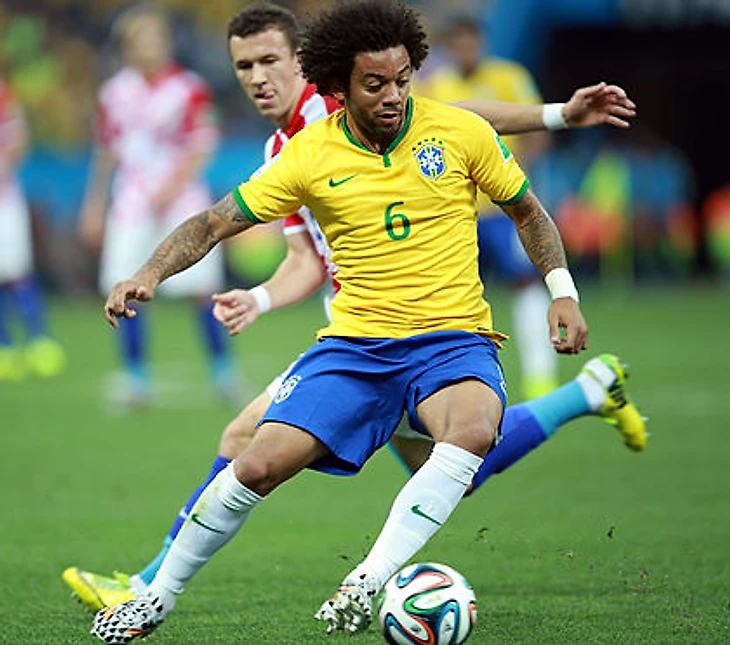 Фото Марсело (в жёлтом) против хорвата Ивана Перишича в первом матче чемпионата мира 2014 года