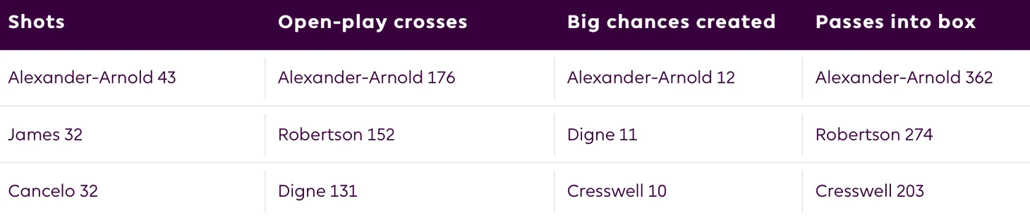 Трент сделал больше ударов, кроссов, создал больше ключевых моментов и больше всех доставлял мяч в штрафную, чем любой защитник АПЛ в этом сезоне.