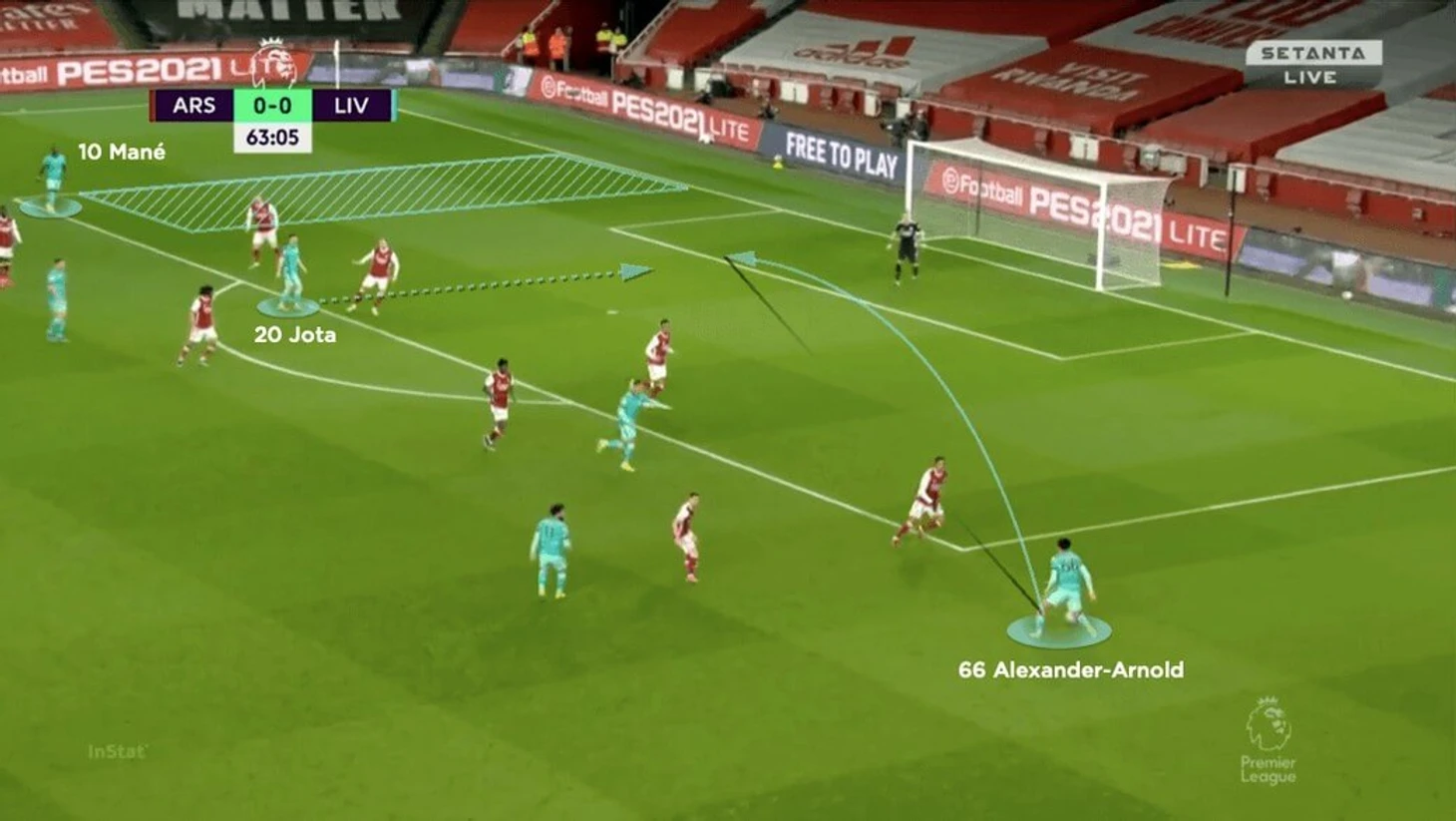 Против ''Арсенала'' связка Салаха и Трента была самой продуктивной. Они переключались между флангом и полуфлангом, что затрудняло отслеживание их движения и сокращало расстояние для передач между ними. Неудивительно, что решающий гол родился из двух комбинаций на фланге, после которых последовал великолепный кросс Александер-Арнольда на Диогу Жоту.