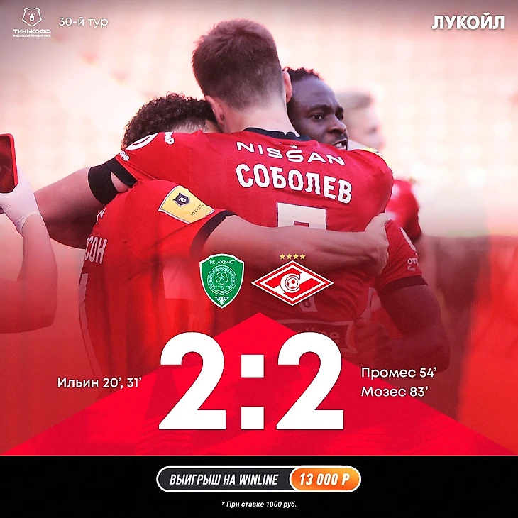 «Спартак» в матче 30-го тура РПЛ сыграл вничью с «Ахматом» (2:2).