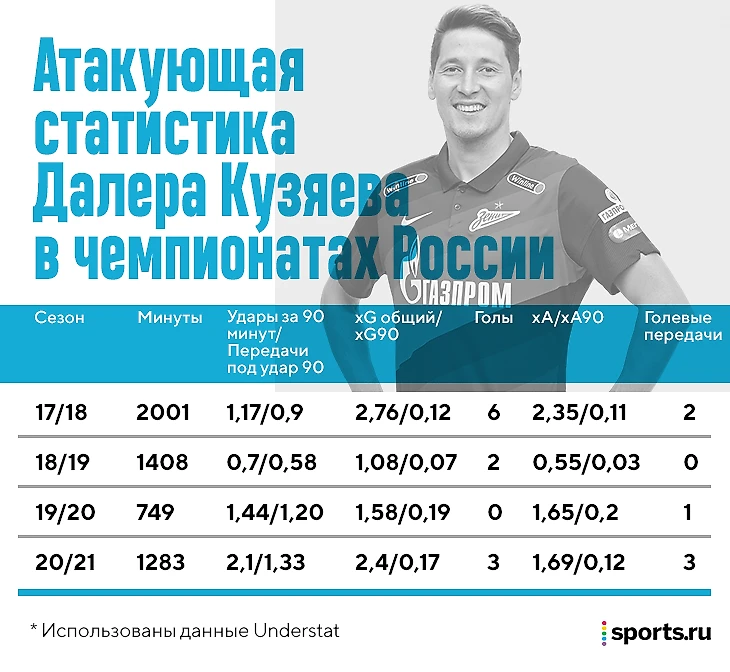 Играя на фланге, он получает много свободы – часто оказывается на одной линии с Азмуном и Дзюбой или создает численное преимущество в центре и позиционных атаках на противоположном фланге. Статистика подтверждает, что Кузяев добавил в качестве. Еще никогда он не был так сильно вовлечен в атаки.