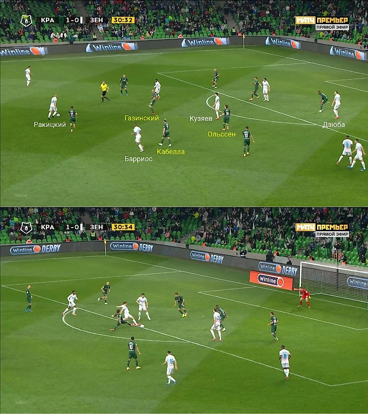 В матче против «Краснодара» Далер был левым вингером, но тоже заполнял середину с ориентиром на Дзюбу. Так петербуржцы навели смуту: на подстраховку к эпизоду выдвинулся Ольссон, плюс немного разрывался в ожидании заброса Газинский. Кузяев оторвался от Классона и был готов принять передачу от бразильца или ворваться в штрафную.