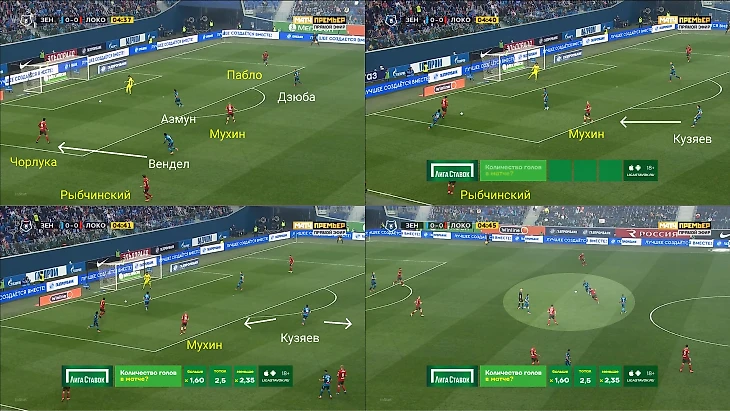 Чтобы выключить ромб Николича, Семак выбрал такую структуру: Дзюба и Азмун контролировали Чорлуку с Пабло, Вендел и Малком занимали узкие позиции в полуфлангах, а Кузяев выдвигался к Мухину. «Зенит» выгонял «Локо» на фланги. Если гости выходили через Рыбчинского – к нему выдвигался Вендел (затем Дриусси), Барриос закрывал центр, а Дуглас помогал с Бариновым. В первые минуты после такого прессинга «Зенит» сделал три захода к чужим воротам.